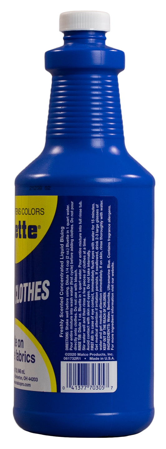 Bluette® Laundry Whitener, a choice passed down through generations, is a concentrated laundry bluing product that guarantees vibrant colors and pristine whites while safely treating delicate fabrics. Bluette enhances the brightness of your clothing, leaving it looking remarkably crisp after each wash. Its gentle formula is suitable for both machine-washed and hand-washed items.