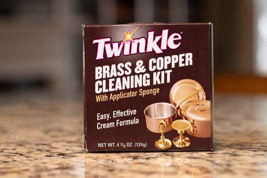 Twinkle® Brass & Copper Cleaning Kit is designed to revitalize brass, copper, and other shiny surfaces effortlessly. This non-scratch formula ensures a quick dissolution of tarnish and cooked-on stains, eliminating the need for vigorous scrubbing. The kit includes a convenient applicator sponge for easy application. With the added benefit of an anti-tarnish ingredient, Twinkle keeps copper surfaces gleaming for a prolonged period.